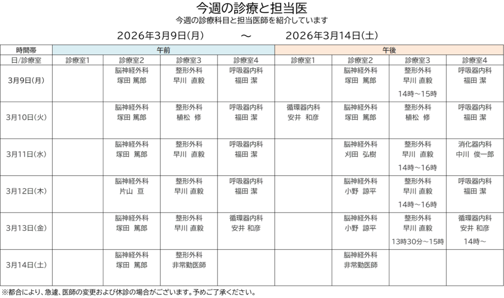 2026年3月9日(月)から3月14日(土)までの外来診療についてご案内いたします。