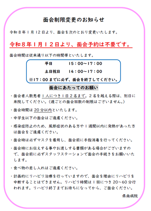 • 感染症予防のため、風邪症状のある方や過去1週間以内に発熱があった方のご面会はご遠慮ください。