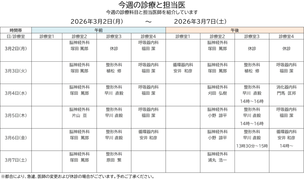 2026年3月2日(月)から3月7日(土)までの外来診療についてご案内いたします。