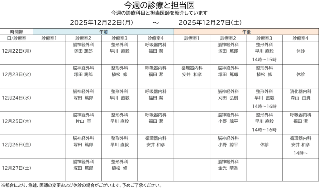 ◇今週の診療と担当医 12月22日~12月27日