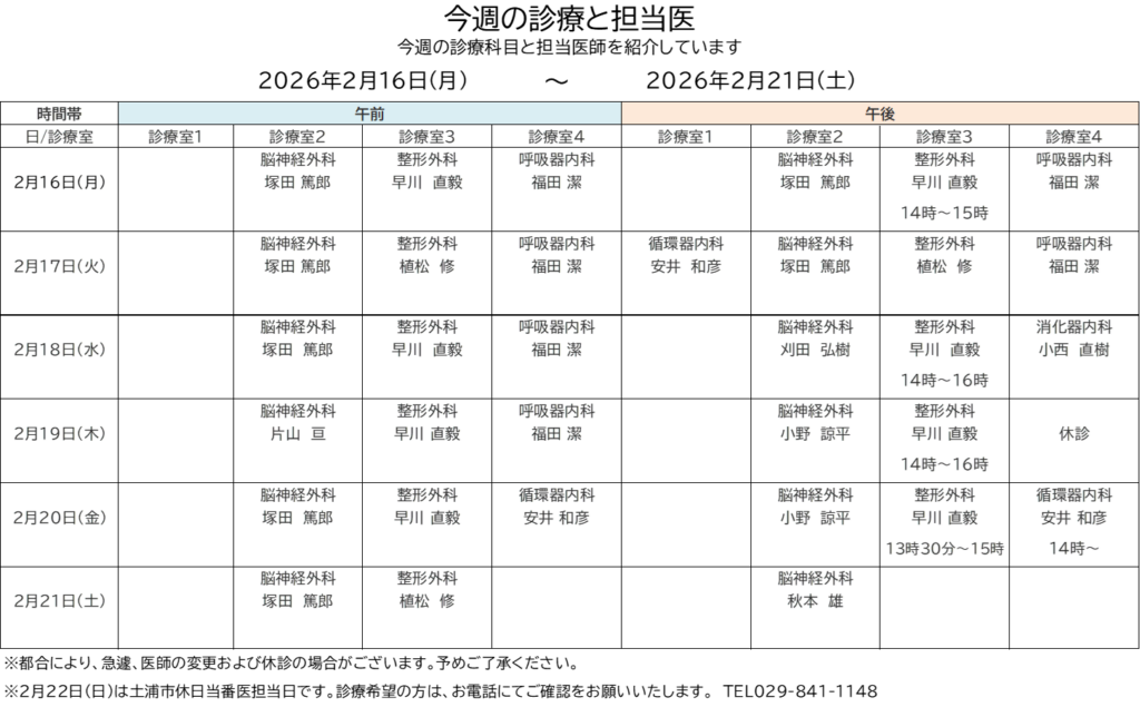 2026年2月16日(月)から2月21日(土)までの外来診療についてご案内いたします。