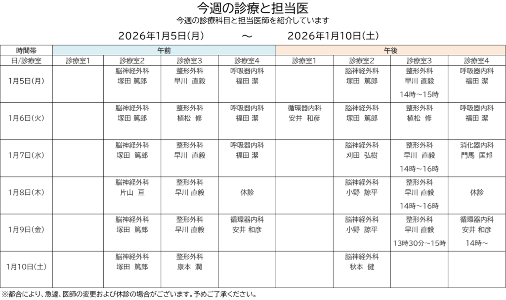 ◇今週の診療と担当医 2026年1月5日~1月10日